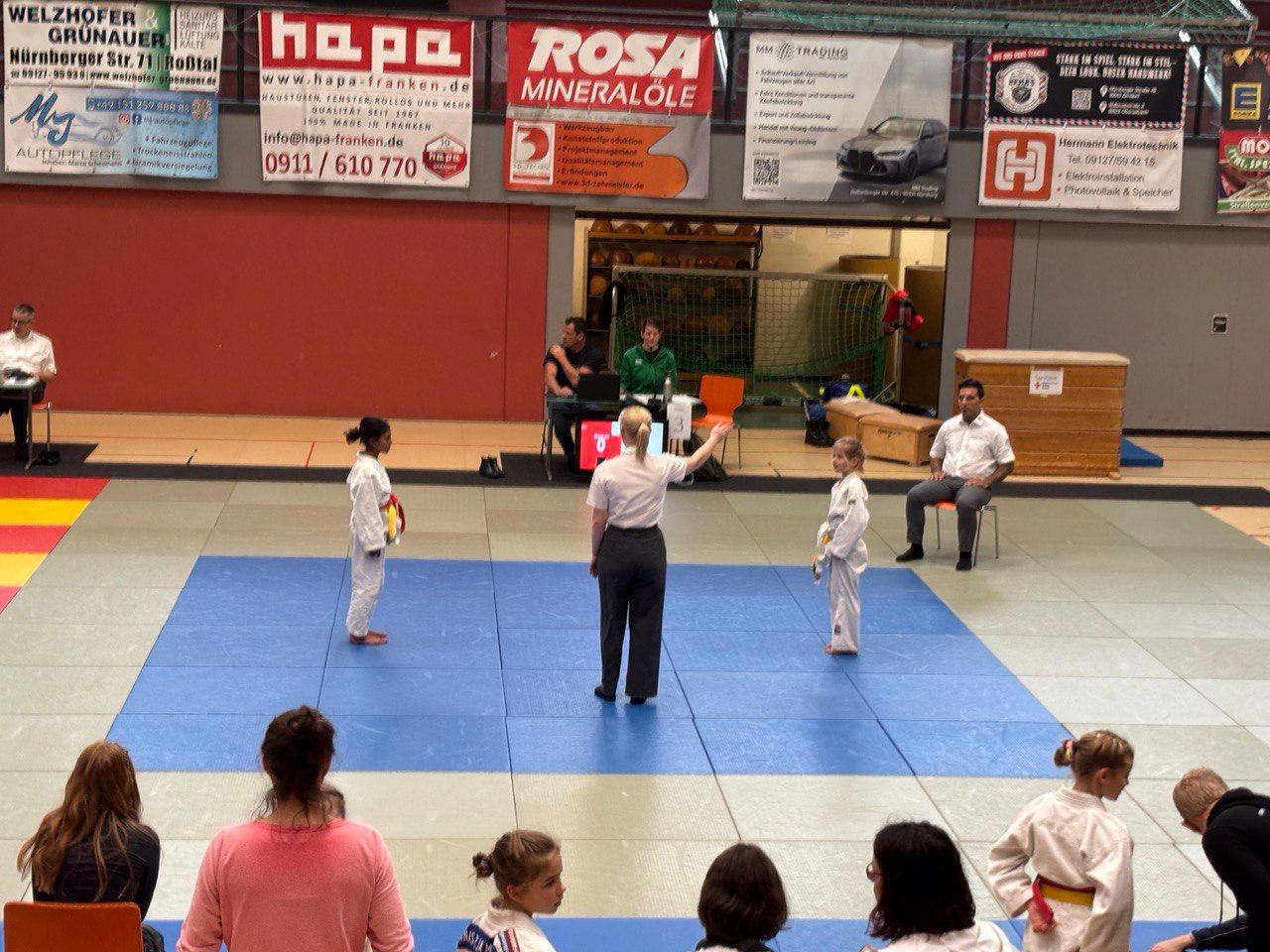 Jana trat in ihrer Gewichtsklasse gegen zwei Gegnerinnen an – Emma vom FV Wendelstein und Sunniva vom TSV Wachendorf. Gegen Emma, die bereits etwas mehr Erfahrung und einen höheren Gürtelgrad hatte, konnte Jana zunächst gut mithalten, unterlag aber letztlich mit 2:8. Emma gewann im Anschluss auch gegen Sunniva. Im dritten Kampf zeigte Jana ihr Können und besiegte Sunniva souverän mit 8:0. Somit erreichte Jana den zweiten Platz.